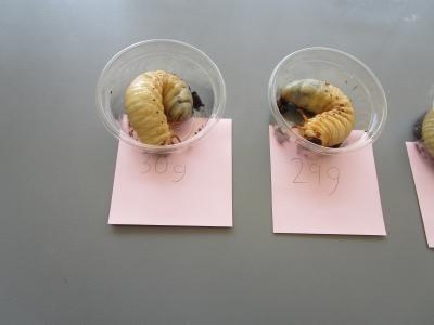 ↑幼虫をカップに入れて重さを測りました。
