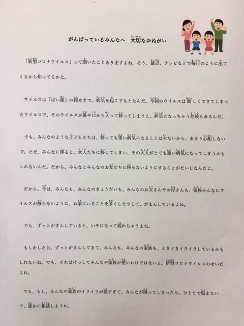 新型コロナウイルスにかからないように、やりたいことをがまんしてがんばっているみなさんへ。