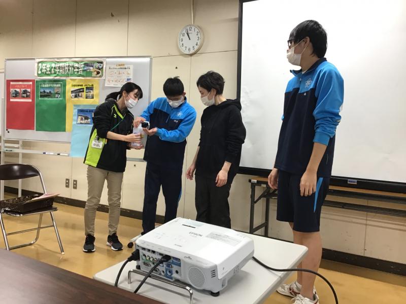 12月に行う校外学習に向けて、高等部2年生に『アルコール手指消毒の方法』と『マスクの扱い方』についての保健指導を行いました。“アルコール手指消毒では、手の平しか消毒していなかった”や“マスクを外した後は、袋に入れず、そのままポケットに入れていた”という声が多く聞かれました。授業後も正しい方法を意識して手指消毒ができるように、児童生徒玄関にはポスターを掲示しました。