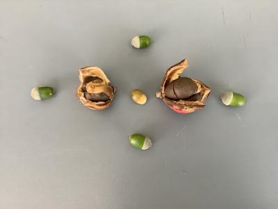 ↓「いろんな木の実がありました」(枝になってる緑のどんぐりも採りましたね)