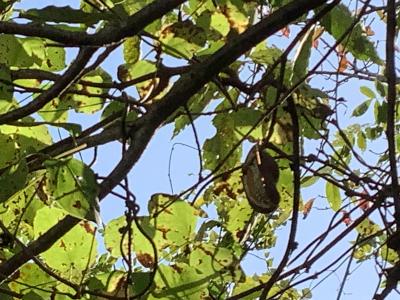 ↓「アケビ!先生、はしご持ってきて、採ってくださいよー」(い、いやあ、採るの大変そうだけど。食べたいね)