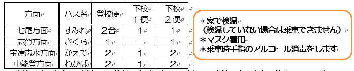 通常日課での各方面のスクールバスの乗車率を検討し、以下のように増便します(2台運行になるところが1台増)。運行ルートや各バス停の発着時刻は変わりません。