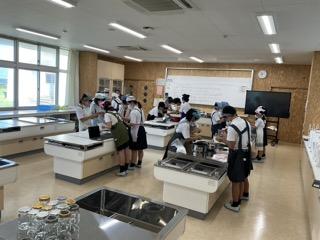 家庭科「夏をすずしく さわやかに」の学習で、手洗いの仕方について学びました。「もみ洗い」「つまみ洗い」「ねじりしぼり」などの洗い方や乾きやすい干し方を確認してから実践しました。また洗剤や水の量を計算し、電子ばかりやビーカーを使って測りました。洗濯後はテラスに干しました。靴下や敷物の準備をありがとうございました。おうちでもできるといいですね。