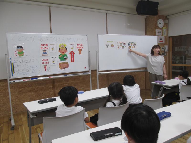 給食センターの細山先生(栄養教諭)と、朝ごはんについて学習しました。