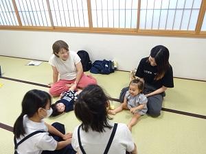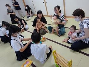 地域交流クラブでは、「赤ちゃん交流会」を主催し、10組の赤ちゃんとお母さんが来てくださいました。赤ちゃんと一緒に、手遊びをしたり本の読み聞かせをしたりしながら、楽しく交流することができました。