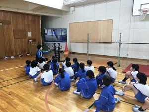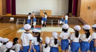 今まで身につけた技を組み合わせてグループごとにマット運動の演技をしました。校歌に合わせて、どんな技をどのように組み合わせればいいのか、グループで相談しながら練習をしてきました。今日はそれを1年生に見てもらいました。校歌を歌いながら見てくれたり、感想をたくさん言ってくれたりして、6年生はとても嬉しそうでした。発表後は一緒におにごっこをしました。