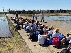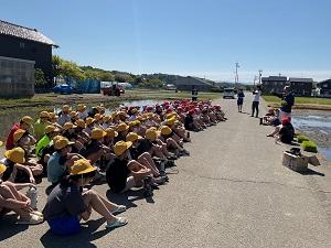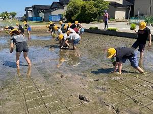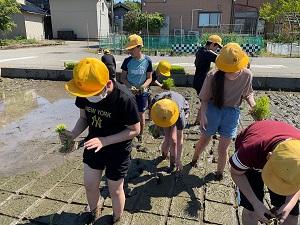 社会科の学習の一環で、狩鹿野にある田んぼをお借りして、田植え体験を行いました。外日角小学校の5年生と一緒にお話を聞き、植え方のコツを生かして苗を植えていきました。