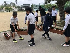 6限 環境委員が人権の花植えに参加しました。玄関が華やかになりました。これから環境委員が水やりなど花のお世話をしていきます。
