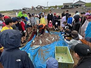 あいにくの雨模様となりましたが、海の状態が良いため、当初の予定通り地引網体験を実施しました。