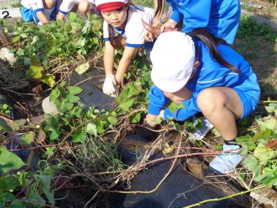 秋晴れのさわやかな今日、1年生は生活科でさつまいもほりをしました。土の中はどうなっているのかな?どれくらいさつまいもがあるのかな?と予想しながら、土を掘りました。「大き~い。チキンみたい。」「モグラに食べられとる。」「つるにいっぱいさつまいもついとるよ。」とお友達と会話をしながら,秋の実りを実感していました。みんなでお世話したおかげで,どちらのクラスもたくさんさつまいもが収穫できました。さて、どうやって食べようかな。