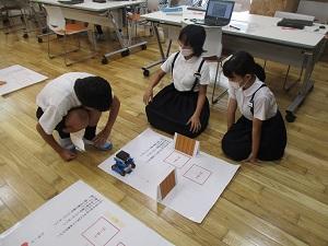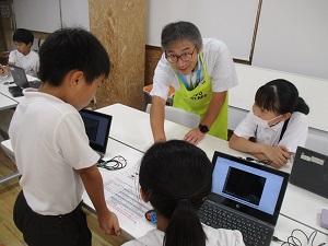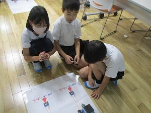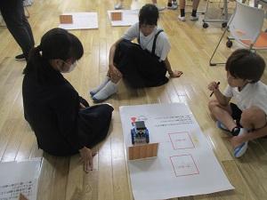 はじめに、ichigojamのLEDが付いたり消えたりするコマンドを打ち、もっと長くつけるにはどうしたらいいか試してみたり、ロボットが動かすことに応用したりしました。次の時間は本格的なプログラミングです。ロボットにどんな動きをさせたいか、自分たちで考え、実際に打ち込んで動かしてみる体験をしました。実際にやってみると、ちょっとしたミスで思っていた動きがなかなかできず難しい面もありましたが、筋道を立てて考えていくことの大切さを実感できたようです。昨日に引き続きご指導いただいた、PFUの皆様、2日間のご指導、本当にありがとうございました。