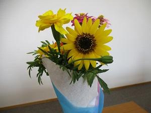 ほっとルームの子供たちが、1学期に種から育てたほっとガーデンにヒマワリや百日草がきれいな花を咲かせています。今日、校長室に花束を作って持ってきてくれました。どうもありがとうございます