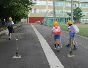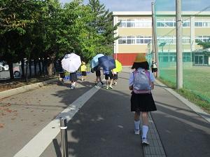 今日はとても暑い1日になりましたね。熱中症警戒アラートも出ていましたので、下校時の様子を職員で巡回指導しました。これからも、暑い日が続くことが予想されますので、本校では日傘や冷感タオル等の使用も推奨しています。ただしくれぐれも記名等を忘れずにしてください。また、クールリングなどは子供のことですので破損も考えられます。その場合はご了承願います。