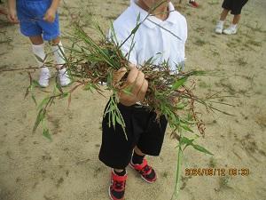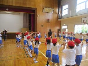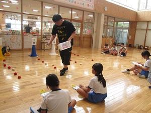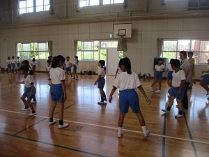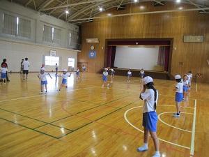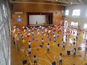 今日は雨が時々降るとっても蒸し暑い1日でしたね。そんな中、1・2年生は体育館で団体競技の玉入れの練習をしていました。音楽に合わせて、ダンスをした後、みんなで玉を入れるというスタイルで、とってもかわいい玉入れでしたよ。