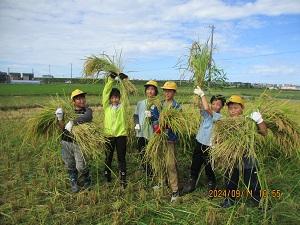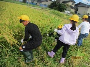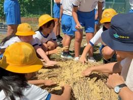 さて今日は5年生が5月に植えた田んぼの苗を刈り取る、稲刈り体験です。外日角小学校の5年生と一緒に、狩鹿野地区で体験をさせていただいている渡辺さんの水田に行きました。9時からのスタートでしたが、やはり暑さが心配でしたので、渡辺さんのご厚意で、早めに切り上げさせていただきました。それでも初めての稲刈り体験の児童も多く、「鎌の『ザクッ』という音がとても気持ちよかった」と話してくれる子もいました。今後七塚小七キラカンパニーはこのお米を生かしてスイーツをつくろうと考えています。その様子はまたHPでお伝えしていこうと思いますので、どうぞお楽しみに(^^)/
