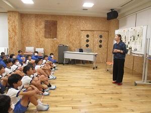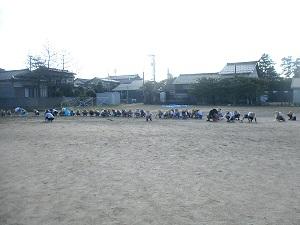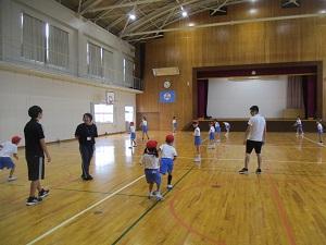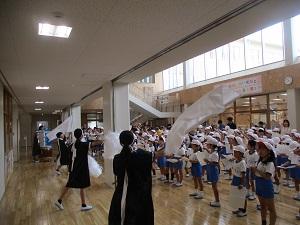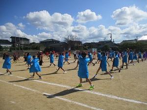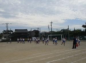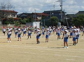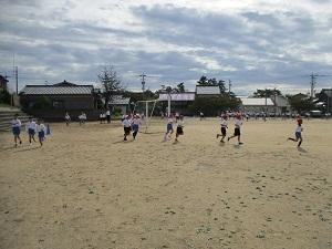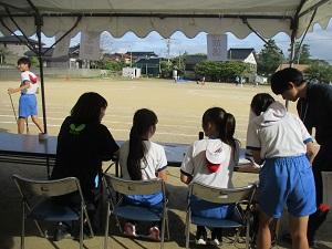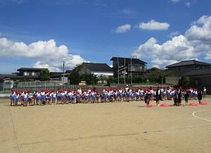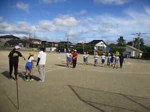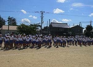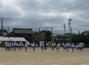 朝方に雨が降るという予報で開催が危ぶまれましたが、PTAの皆さんの熱意のおかげで何とか曇りのお天気となりました。しかし蒸し暑さや雨の心配もあったため、1時間半の予定を短縮して、1時間で実施しました。
