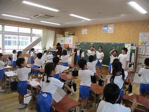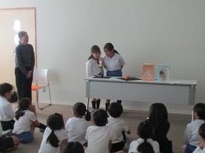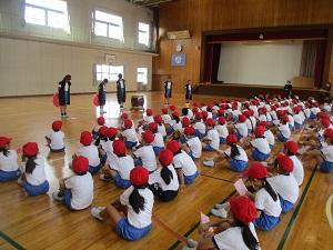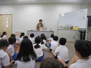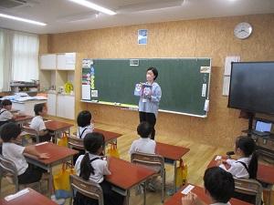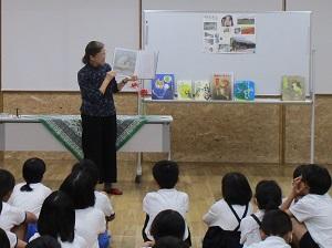 本日,やまんばさんによるお話会がありました。1年生はこれから国語科で「くじらぐも」の学習が始まります。お話会では,「くじらぐも」の原作者である中川李枝子作品をいろいろ紹介していただき,その中から「そらいろのたね」という絵本の読み聞かせをしてもらいました。やまんばさんの上手な読み聞かせに子供たちは絵本の世界に入り込んでいました。