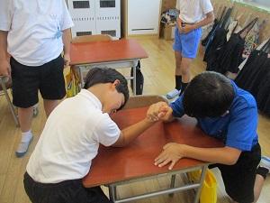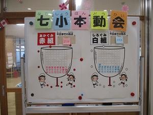 体力テストの結果から七塚っ子の弱みである握力に関係した「腕相撲」や「指相撲」や、「だるまさんの一日」という遊びの中に、いろいろな体つくりの運動を盛り込んだものもありました。しっかり体を動かして、脳のスイッチも入ったようですね。