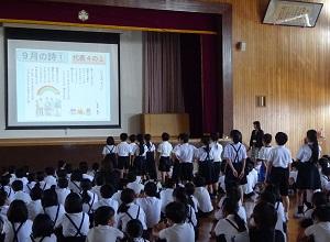 今日は1限目に学校集会がありました。今日はいつもしている児童集会がなく、表彰伝達と校長先生のお話でした。9月の詩の発表は4年生でした。とても頑張りましたね。
