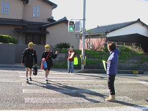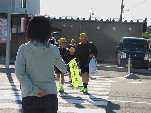 あいさつ運動を3年生がしています。