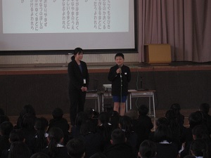 話し方大会に向けて,3年生の塚本さんが全校の前で「命を守るお仕事」について話しました。お母さんの仕事に興味をもったこと,自分も将来その仕事をしてみたいと考えていることなど話をしました。