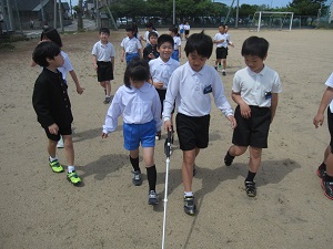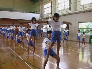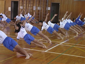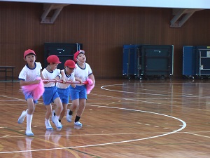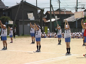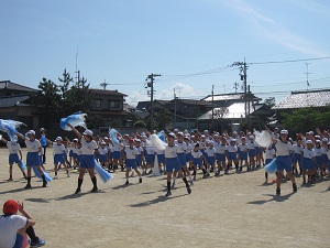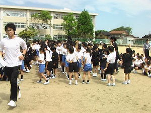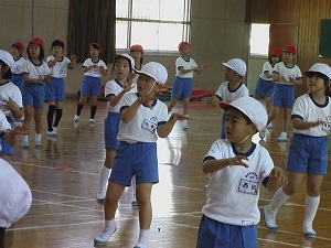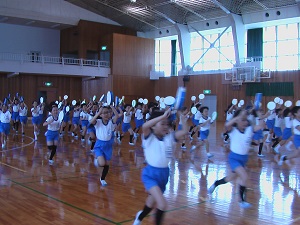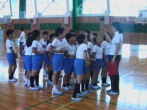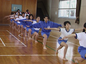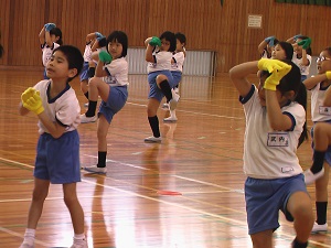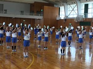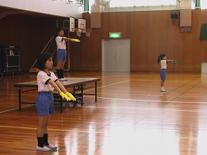 本番での美しい演技をめざして、4年生ががんばっています。練習の始まりと終わりを5人の実行委員で行っているのも、主体的な姿につながっています。