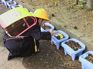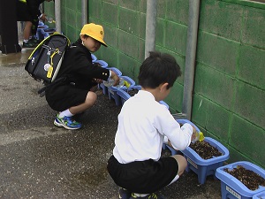 2年生が育てていたチューリップが、色とりどりの花を咲かせています。「きれいに咲いたよ。」「いいにおいがするよ。」と、自分のチューリップを自慢げに紹介してくれました。きれいに咲いてよかったね!