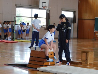 跳び箱からはじまり、マット、鉄棒と演技が進みます。七塚小の息の合った演技や、マットのすごい技を褒めてもらえました。器械運動交歓会を大成功で終えることができ、子ども達も満足そうにしていました。