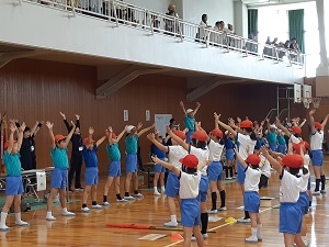 先週は、げんきっず体操ができず見学していた1年生も、今日から元気に体操を始めました。テレビや担任の先生を見ながら、元気いっぱいに体操していました。