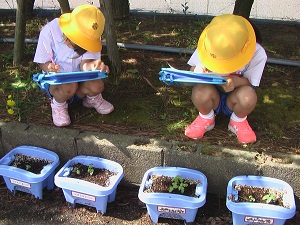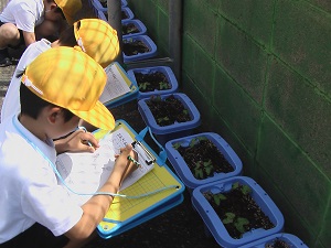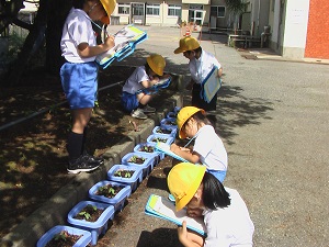鮮やかな桃色の花に、1年生も楽しく鑑賞しました。