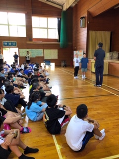 2日目・朝の集いでの学校紹介。