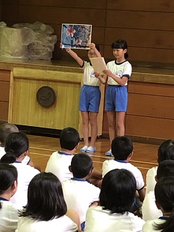 朝の読書の時間に、ぴーかーぶー文庫の坂本さんに読み聞かせをしていただきました。