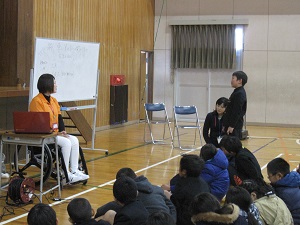 学校防災アドバイザーとして金沢大学の青木先生からのお話を聞くことができました。今回は近くに先生がいましたが、近くに先生や大人がいない場合の行動、逃げ遅れている小さな子がいたら、手をつないで一緒に避難する等教えていただきました。