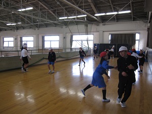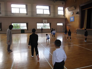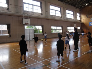 体育館で,1~6年生が楽しそうにフリスビードッジボールやだるまさんがころんだ,ケイどろ鬼ごっこをしていました。みんなとても良い表情をしています。