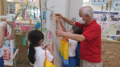 休み時間には、図書館の前にある七夕の笹に子ども達と一緒に願い事を書いていただきました。
