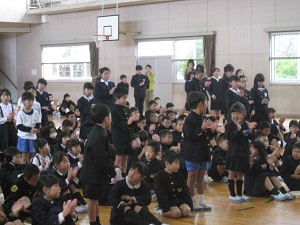 校長先生のお話です。あいさつ・自分たちで学ぶ・そうじの3つをほめてもらえました。これからも良い行動は続けたいですね。