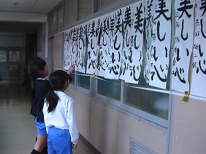 校内書き初め大会の審査が終わり、各教室前に展示してあります。子ども達も審査結果が気になり、休み時間にはたくさんの子が鑑賞していました。