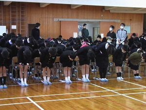今日から、卒業式に向けての在校生練習が始まりました。卒業生に感謝の気持ちを伝えようと、みんな姿勢よく座り、立ち、拍手をしていました。礼の姿勢もばっちり揃いました。本番の卒業式も、教室で身につけたよい姿勢で、卒業生を送ってほしいと思います。