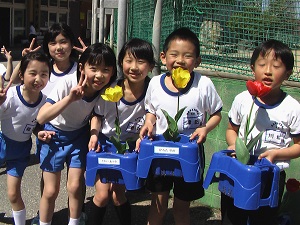 2年生が育てていたチューリップが、色とりどりの花を咲かせています。「きれいに咲いたよ。」「いいにおいがするよ。」と、自分のチューリップを自慢げに紹介してくれました。きれいに咲いてよかったね!