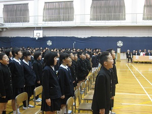 入学した1年生をお祝いする「1年生おめでとう集会」を開きました。主催したのは、2年生。まずは、温かい拍手で1年生を迎え、校歌を歌ってお祝いしました。