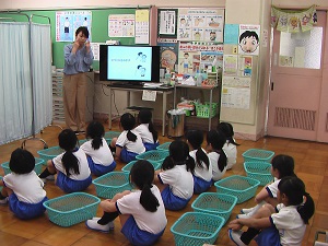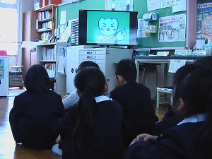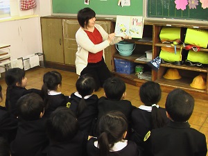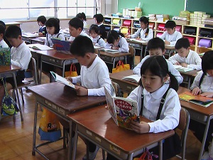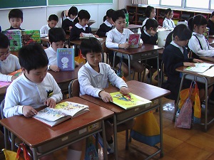 まだ、本を読めない1年生は、担任が読み聞かせをしていました。静かに、姿勢よく聞いていました。