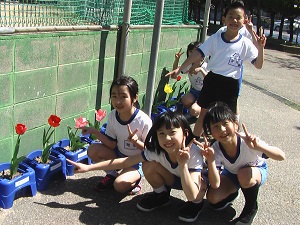 2年生が育てていたチューリップが、色とりどりの花を咲かせています。「きれいに咲いたよ。」「いいにおいがするよ。」と、自分のチューリップを自慢げに紹介してくれました。きれいに咲いてよかったね!