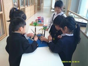 今日もとても穏やかな暖かい日になりました。月曜日には1の1とはまなす子ども園の年長さんが交流しましたが、今日は1の2と木津幼稚園の年長さんが交流会をしました。木津幼稚園さんの年長さんの方か1の2の子供たちより少し人数も多いせいか2人の園児に教えている1年生もいましたが、どのペアもとても上手に作り方や遊び方を教えてあげていました。1年生は今回は2つの園との交流でしたが、3学期には本校に入学する予定の他園の年長さんもお呼びして交流する予定です。本日来ることができなかった年長さんにもお知らせする予定ですので、楽しみにしていてくださいね。