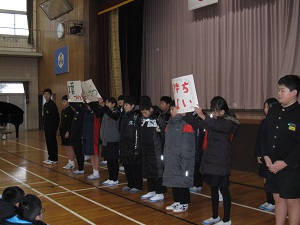 5年生から、2月の生活目標についての提案がありました。「廊下でけが0」をスローガンにがんばりたいですね。
