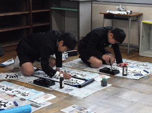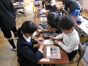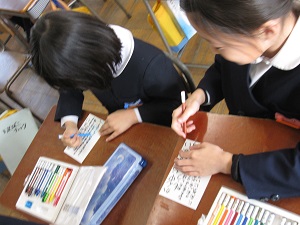 高学年が、低学年のために、どんなイラストを描くとよいか教えたり、アドバイスしていました。今日できあがった寒中見舞いのはがきは日頃からお世話になっている方へ送られます。