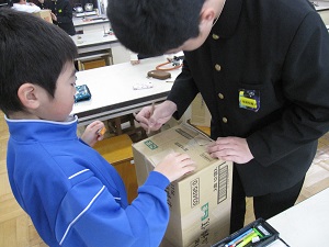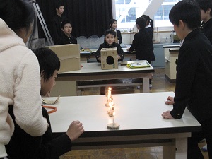 理科クラブでは「段ボールの空気砲」の実験をしていたので、体験活動をしてもらいました。段ボールから押し出された空気がすべての火を消した時は歓声が上がっていました。