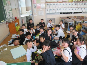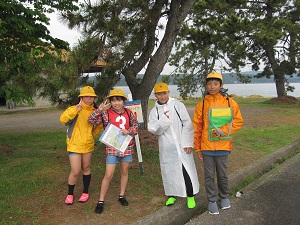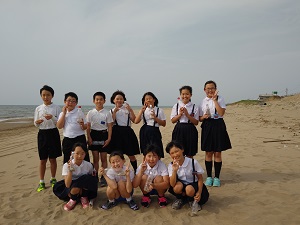 メロディークラブは海岸に行って、ペットボトルに貝殻や流木を入れ、楽器を作りました。みんなとてもよい笑顔です。