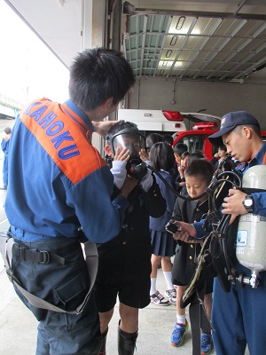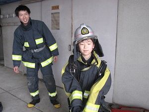 また、防火服とボンベを着せてもらいました。合わせて20kgの装備に、児童は思わず「重すぎる~」と言っていました。