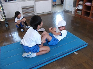 上体起こしです。背中を反らせる子とそうでない子には差があるようです。