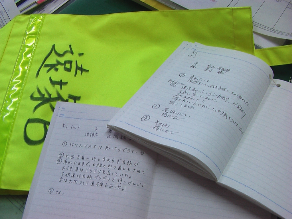 七塚小学校では、月2回と交通安全週間の時などに保護者の方に朝の通学路で街頭指導をしていただいています。その時に、簡単に登校の様子をノートに書いていただいています。